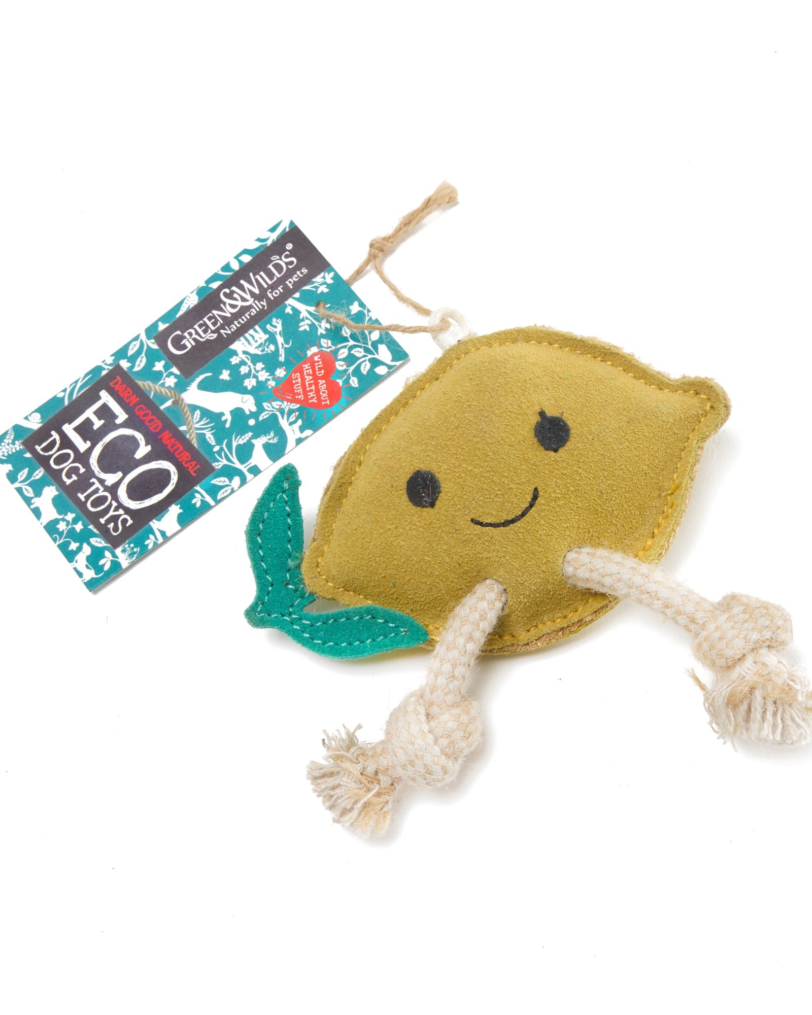 Libby the Lemon has a suede outer layer covering a filling of natural jute fibres and jute rope legs. Jute is a natural, sustainable plant fibre. The suede is a by-product and ensures that this material is not wasted. Tough and long lasting, made without using any compound that would harm or be released when chewed. Jute is 100% biodegradable.