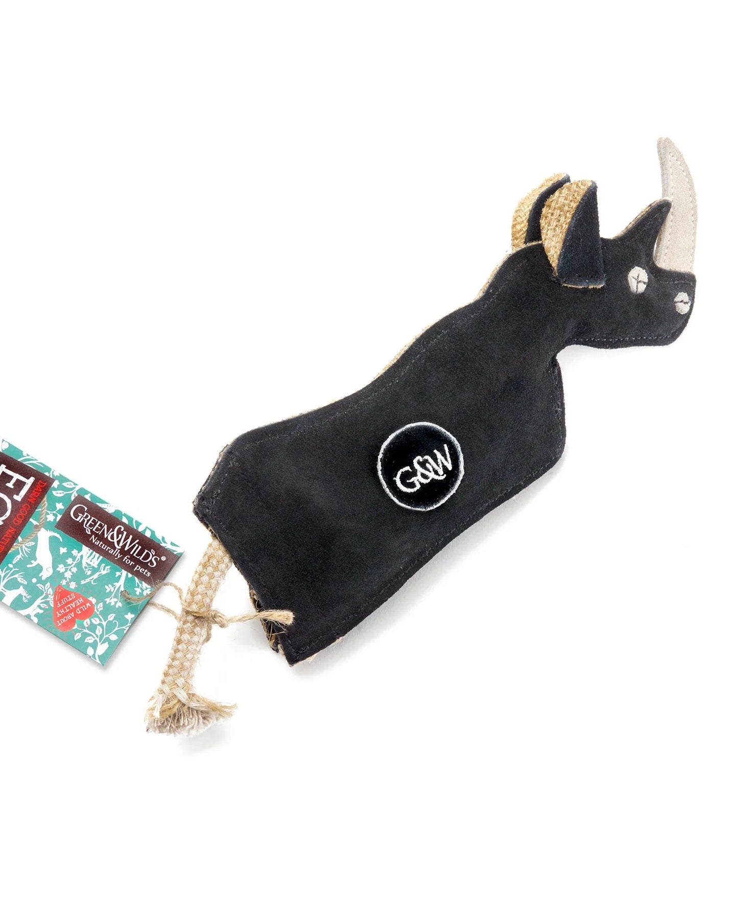 Ronnie the Rhino is made from four layers of jute twin stitched over recycled cotton and jute rope, and a recycled bottle to add that "CRUNCH" when playing. Covered in a soft suede, it has a Velcro behind (ooh er missus!) so you can replace the crinkler bottle or add tasty treats to really get some interest. A toy (and a friend) for you and your dog. A great toy for throwing, dogs can have hours of fun with Ronnie. The toy is made from sustainable jute which is a natural plant fibre. It is tough and long lasting, and is produced without using any added compound that would harm or be released when chewed. Jute is 100% biodegradable. The suede is a by-product and ensures this material is not wasted. Dimensions: 30 cm x 11cm at the highest point x 5 cm at the widest point. Weight: 123g.