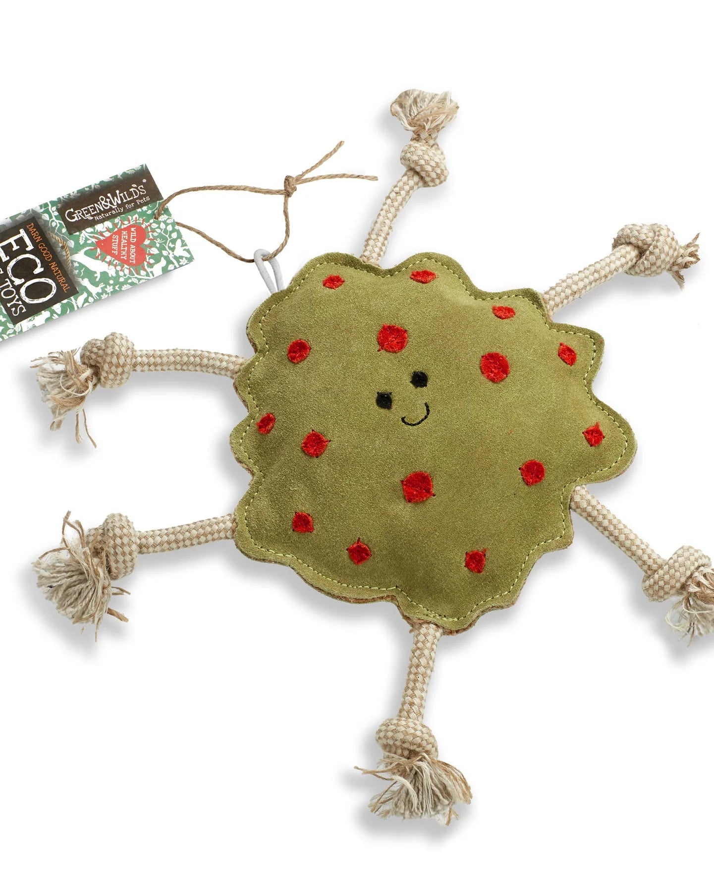 Made from a suede outer with natural jute fibre stuffing and jute rope legs. Jute is a natural, sustainable plant fibre. The suede is a by-product and ensures that this material is not wasted. Tough and long-lasting, made without using any compound that would harm or be released when chewed. Jute is 100% biodegradable.Dimensions: 25 cm x 28 cm x 4 cm. Average Weight: 180g